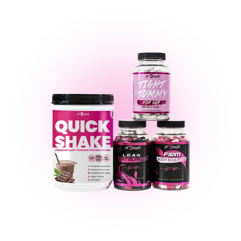 The Quick Shake Bundle includes four Fit Affinity bestsellers: Quick Shake (Chocolate or Vanilla), Lean Fat Burner for Her, Tight Tummy for Her, and Firm Body Sculptor for Her. Together, they provide plant-based protein, support for metabolism, relief from digestion issues, and appetite control.